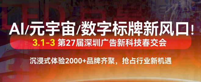 3月1-3日,深圳会展中心(福田),第27届深圳国际广告新科技展(SIGN CHINA)联袂第25届深圳国际LED智显新科技展(LED CHINA)、数字标牌展(DS CHINA)、智慧喷印展(DP CHINA)即将亮相。2000+参展品牌,重磅打造广印及 LED 数字标识全产业链盛宴,不仅汇聚广告标识制作设备、智慧喷印技术、创新材料板材等核心智造,更带来创意灯箱标牌、数字标识、AI 元宇宙、LED 显示屏数字广告等前沿科技,助力行业破解发展瓶颈、抢占市场新风口!即刻点击登记,开启广告前沿盛会。